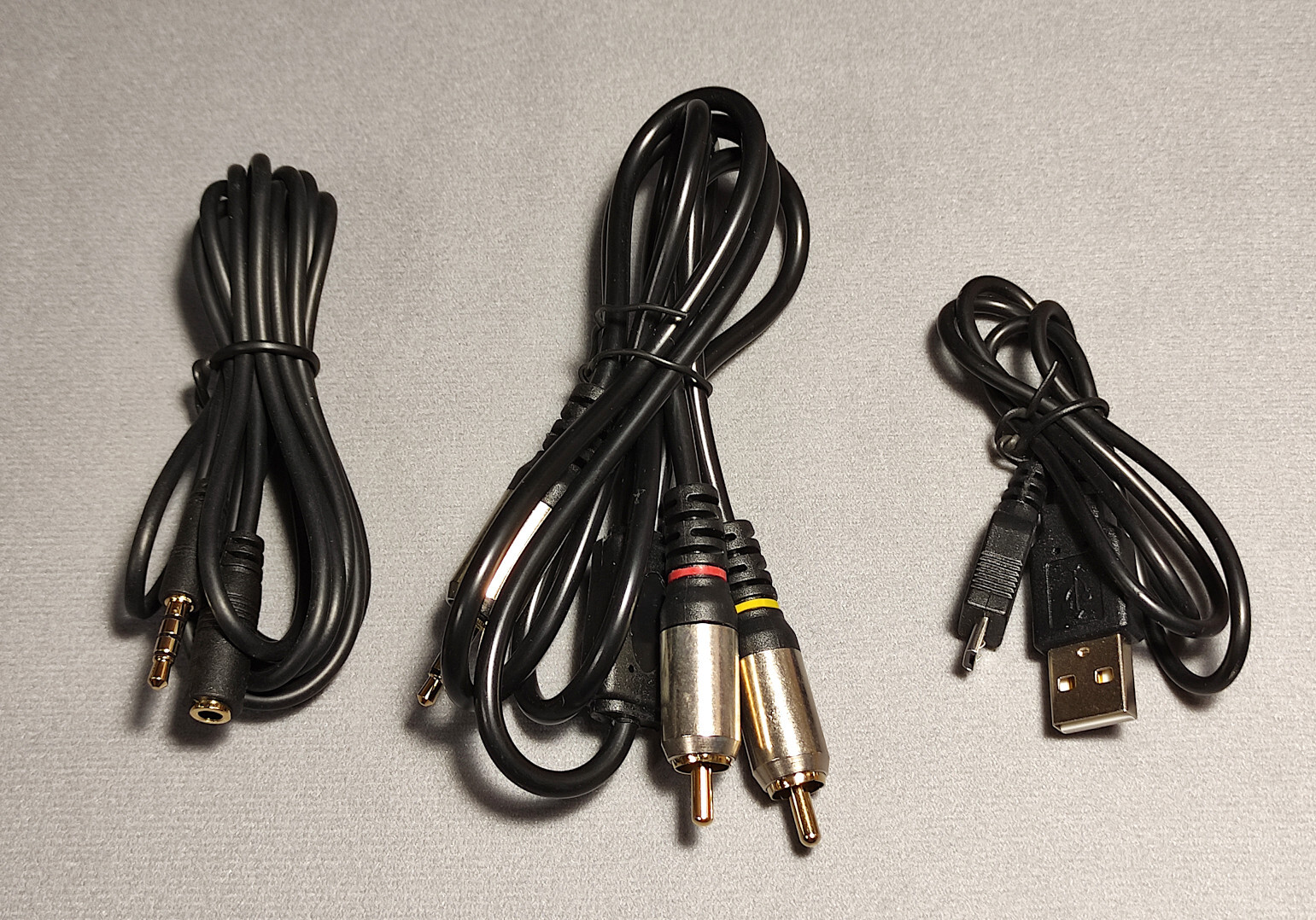 Всё это обрезал, спаял, и закрыл место соединения термоусадкой. Получился длинный провод с разъёмом Mini-Jack на одном конце, а другой конец разветвляется на два отрезка покороче: USB для питания от адаптера или пауэр-банка (предпочитаю этот способ), и RCA для подключения к телевизору.