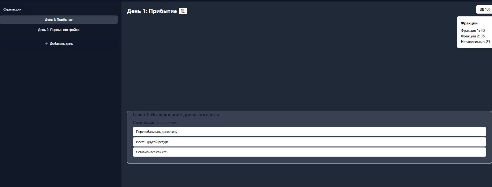Это чисто задумка сделать сайт с интерактивный фанфиком. Я пишу историю и по мере написания происходит решение. Вы как пользователь регистрируетесь на сайте и выбираете фракцию, допустим решение вашей фракции это пункт 1, но вы как жителей не согласны с этим и хотите проголосовать за другое, тогда вы можете это сделать но голосование заблокируется на след. раз. Я пишу следующий день и что произошло и так развивается история. Интерактивная карта есть поселение сделанное в 3д, и все изменение будут отображаться на ней и можно выбирать день видя что изменилось.