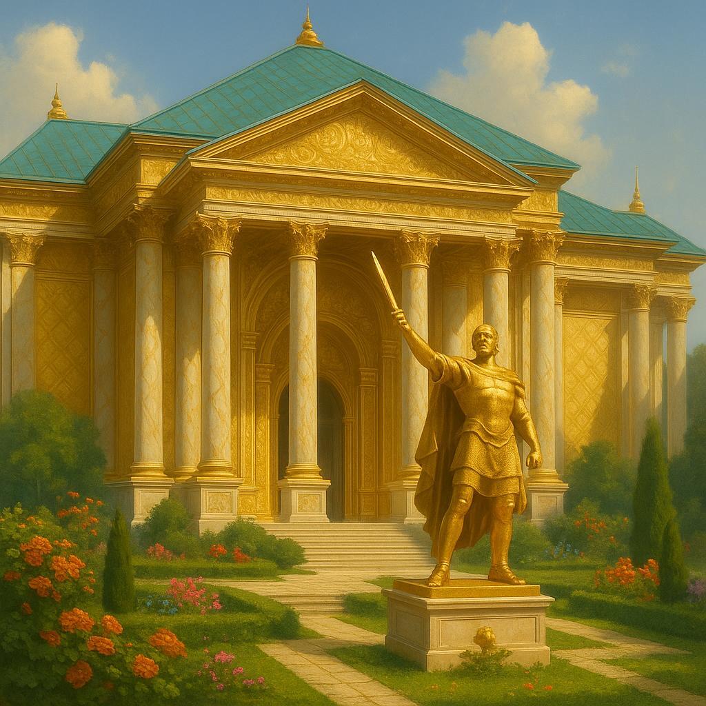 Особняк, больше напоминавший дворец из легенд, поражал воображение своей монументальностью и утончённой пышностью. Высокие колонны из белоснежного мрамора, украшенные тонкими золотыми узорами, подобными переплетениям виноградных лоз, вздымались к массивной крыше, покрытой черепицей глубокого бирюзового оттенка, отливающей перламутром под лучами полуденного солнца. Фасад здания сверкал золотыми пластинами, тонкими, как лепестки, которые переливались, словно чешуя мифического дракона, отражая свет в завораживающем танце теней и бликов. В центре просторного двора, окружённого ухоженными садами с экзотическими цветами, стояла золотая статуя в человеческий рост — величественный воин, застывший в героической позе, с мечом, поднятым к небу, и взглядом, устремлённым в вечность. Его доспехи, вырезанные с ювелирной точностью, казалось, хранили память о давно забытых подвигах.