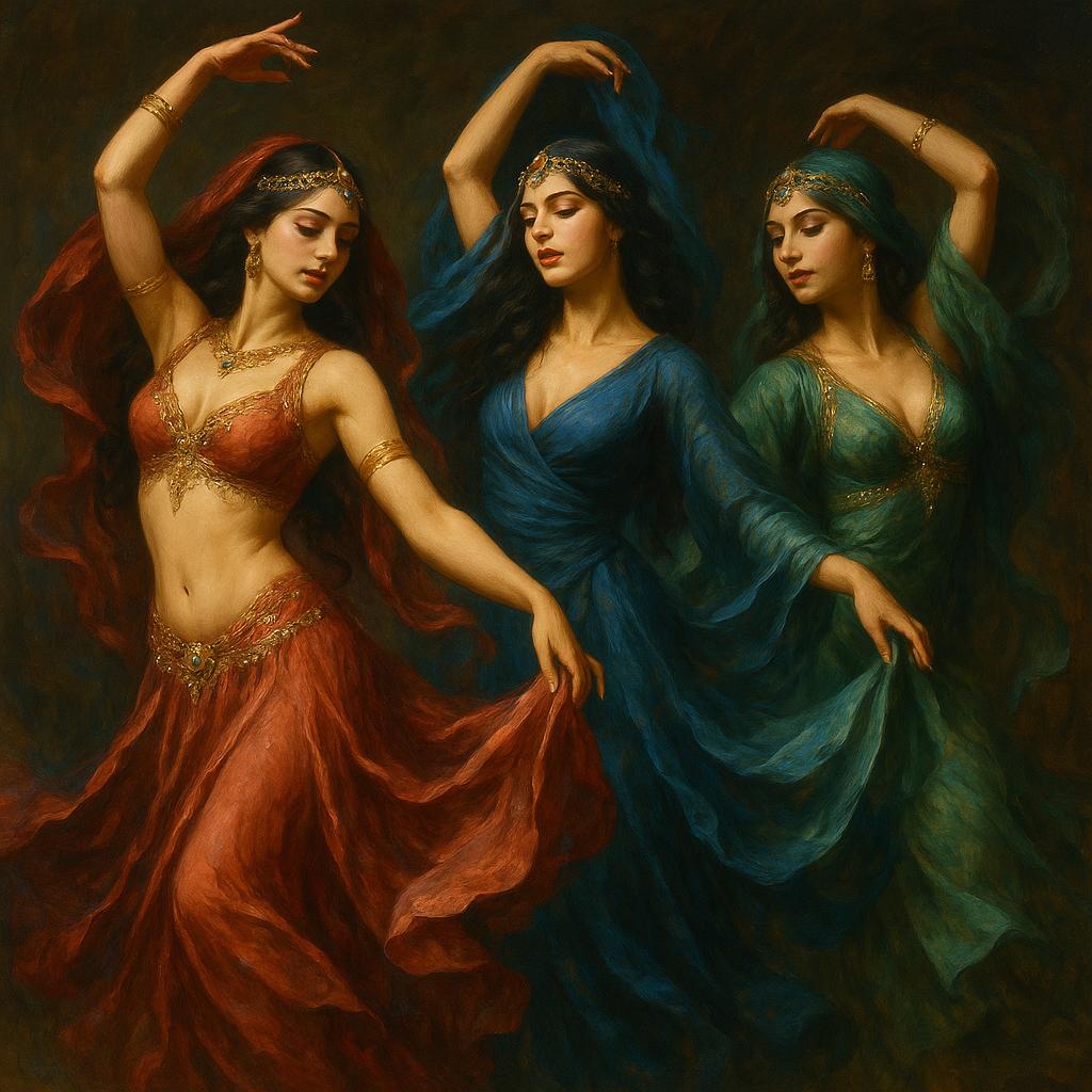 Через мгновение зал преобразился. На центр выбежали пять танцовщиц, каждая из которых была воплощением красоты, превосходящей предыдущую. Их кожа сияла, как полированное золото, а волосы — чёрные, как безлунная ночь, или золотые, как солнечные лучи, — были уложены в сложные прически, украшенные драгоценными камнями, которые ловили свет и отбрасывали мерцающие блики на стены. Воздух наполнился тяжёлым, опьяняющим ароматом благовоний, словно дым из священной курильницы, проникающий в самые потаённые уголки сознания. Мягкая, чувственная мелодия зазвучала, её ритм был медленным, но пульсирующим, как биение сердца в момент страсти.