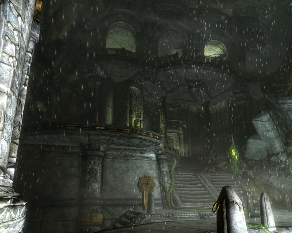 Мостки, как я мимолётно отметил, патрулируют трое двемерских пауков, а пандусы будто обвивают высокую башню, сквозь которую в это озеро обрушивается немалый поток воды. Периодически отвечая огненными стрелами по мордасам отдельным метким ребятам, что даже при моей скорости умудрялись пускать болты всего в метре от того места, где я был долей секунды назад, я по обнаружившимся лестницам вскоре попал, расположенный высоко под сводом.