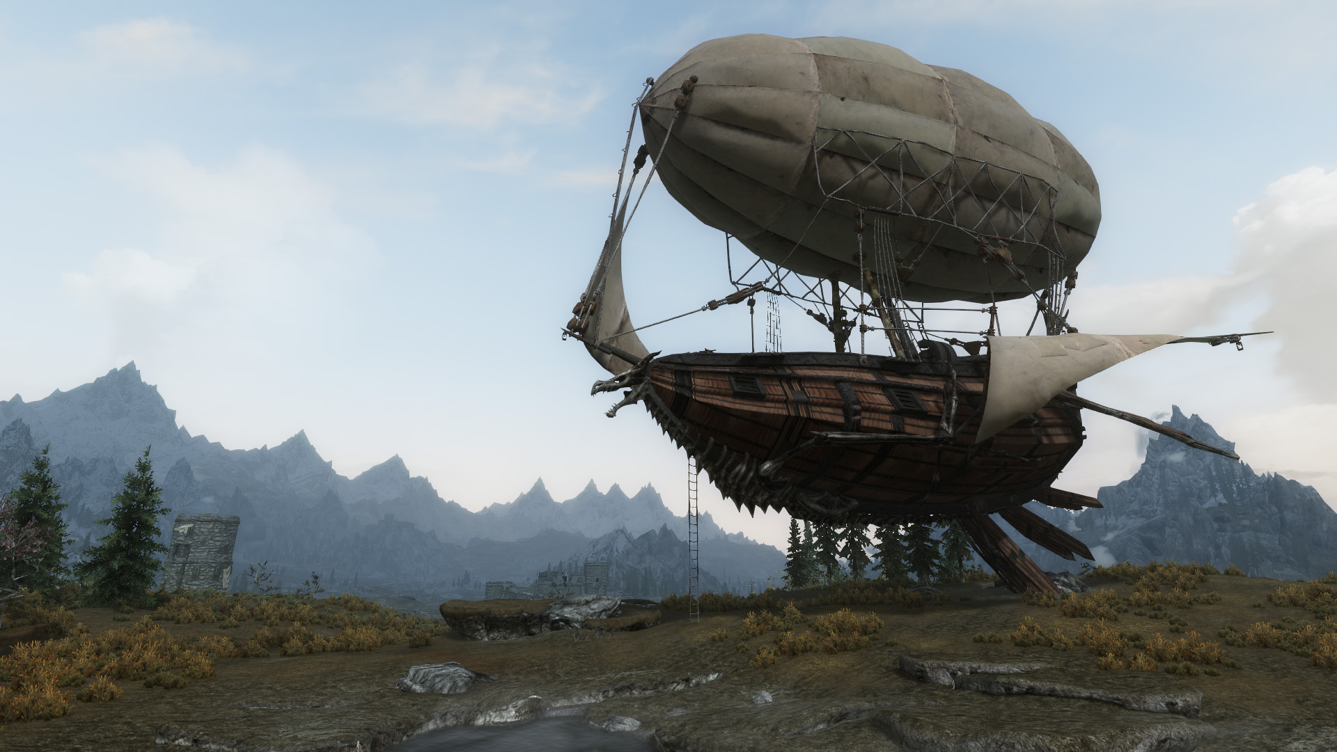 — Э-это… — чуть заикнувшись, эльфийка уставилась на парящий в воздухе пепелац, являющийся несколько творческой переработкой двемерского дирижабля.