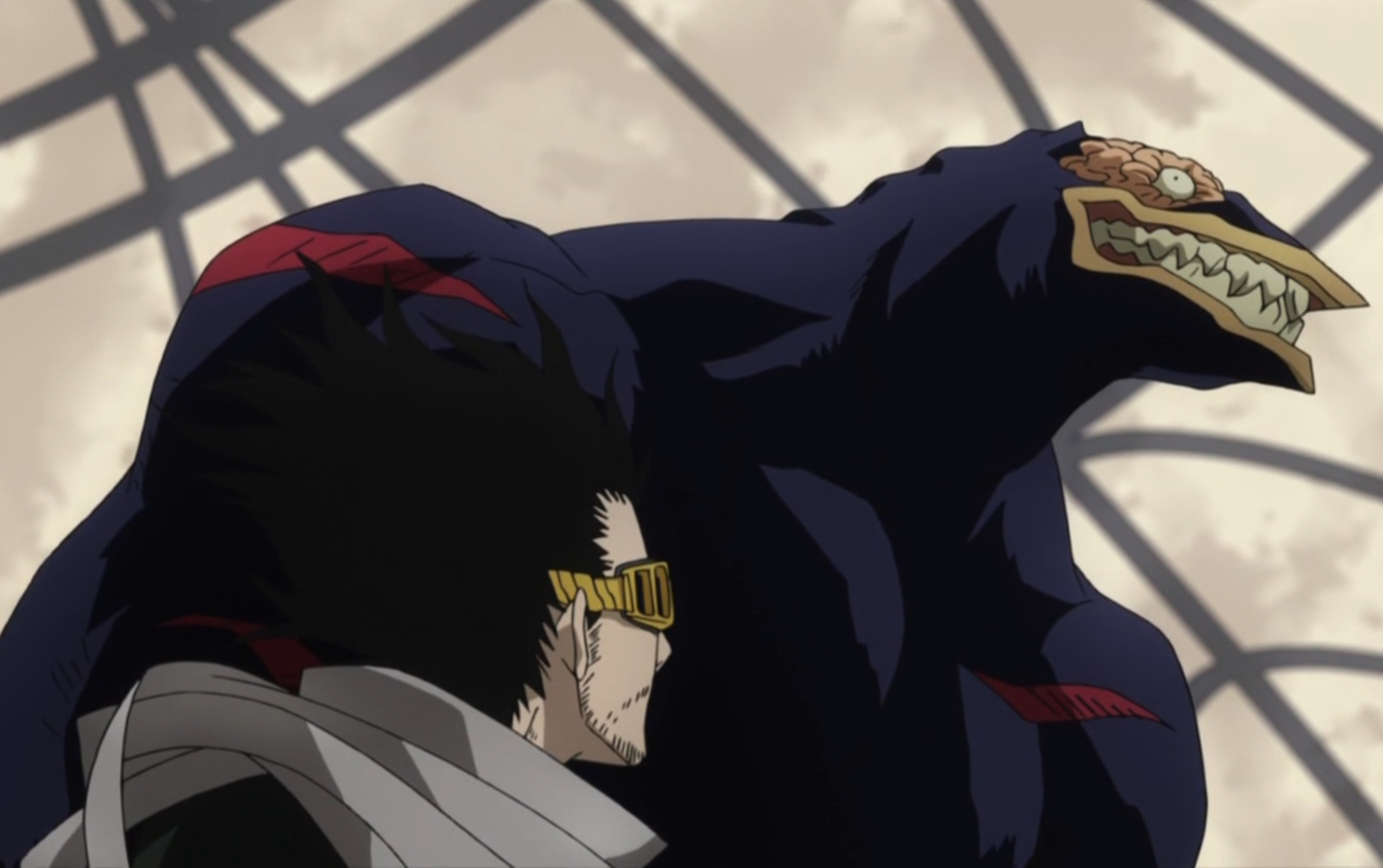 Вот только я ошибся. Рукалицый был не единственным опасным противником здесь. Как только учитель Аизава увеличил с ним дистанцию, в бой вошёл новый участник. Очень мерзкий, должен заметить. Огромный человекоподобный монстр, у которого вместо лица что-то вроде птичьей морды, а верх головы полностью отсутствует, открывая вид на часть мозга.