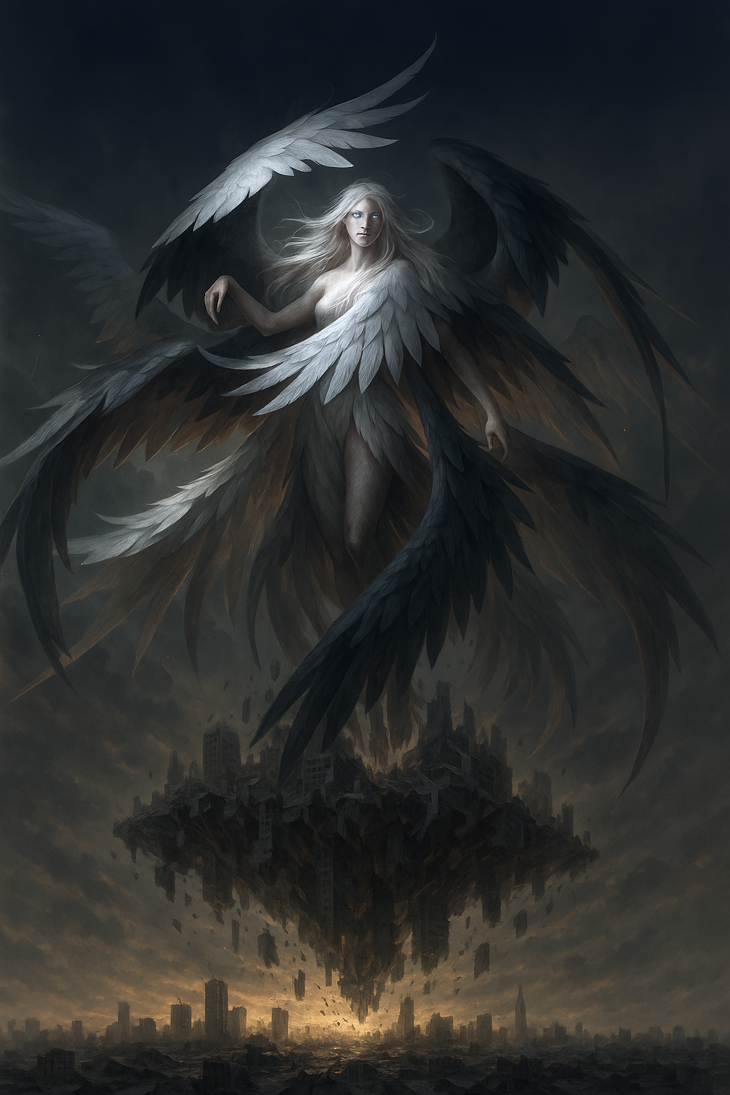 И прямо в центре всего этого огненного хаоса, на высоте пары десятков метров парила она — Симург. Четырёхметровая обнажённая женщина без ярких признаков половой принадлежности. Словно игрушечная кукла для детей, в которой лишь обозначены нужные округлости, но без всяких подробностей. Из её мраморно-белого тела произрастали десятки разного размера крыльев, среди которых выделялись три необыкновенно огромных.