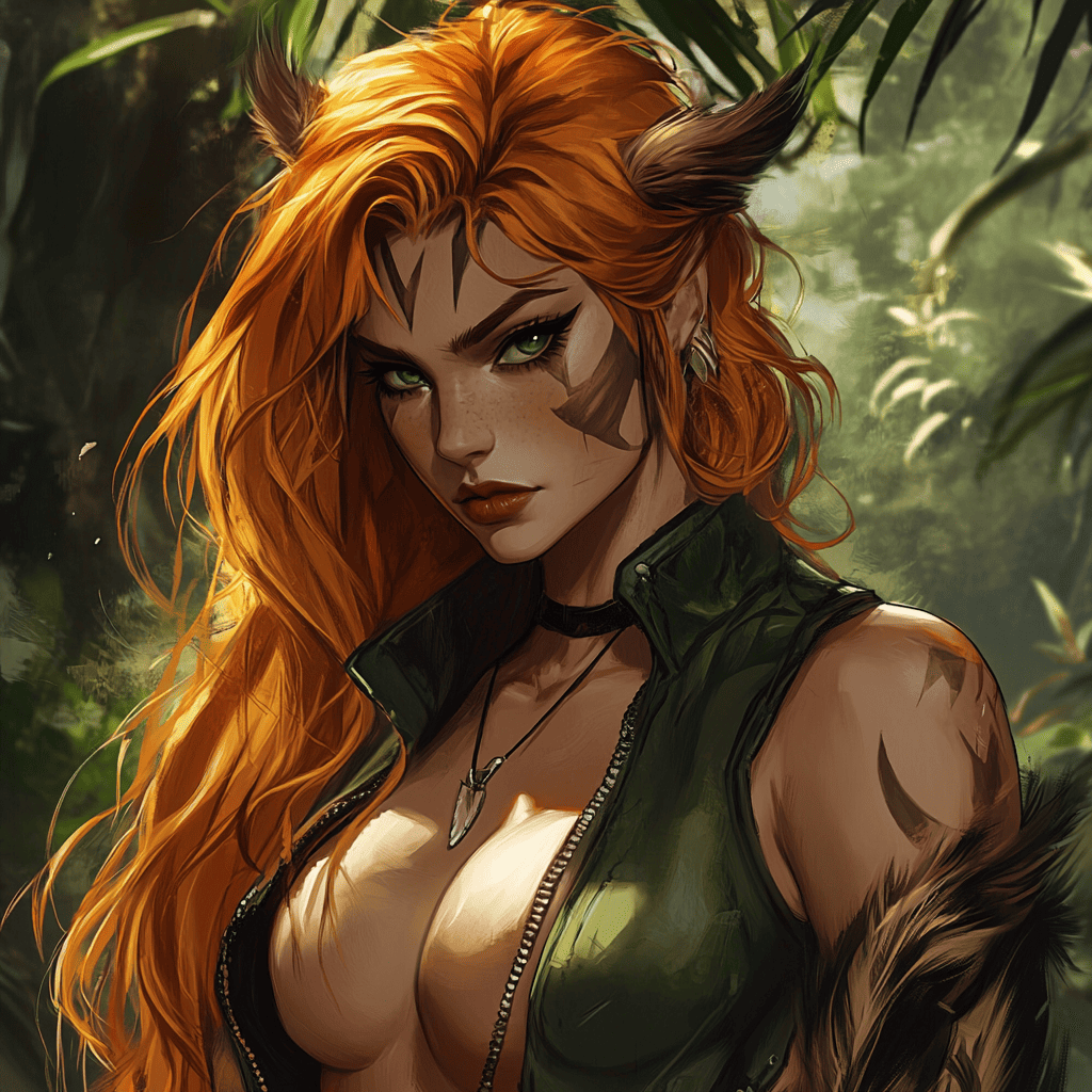 Одетая лишь в короткие кожаные шорты безрукавку, расстегнутую почти до конца, вообще не оставляя места для фантазии, она была похожа на настоящую дикарку, выдернутую из какого-нибудь клишированного фильма про жителей Амазонии или Центральной Африки.