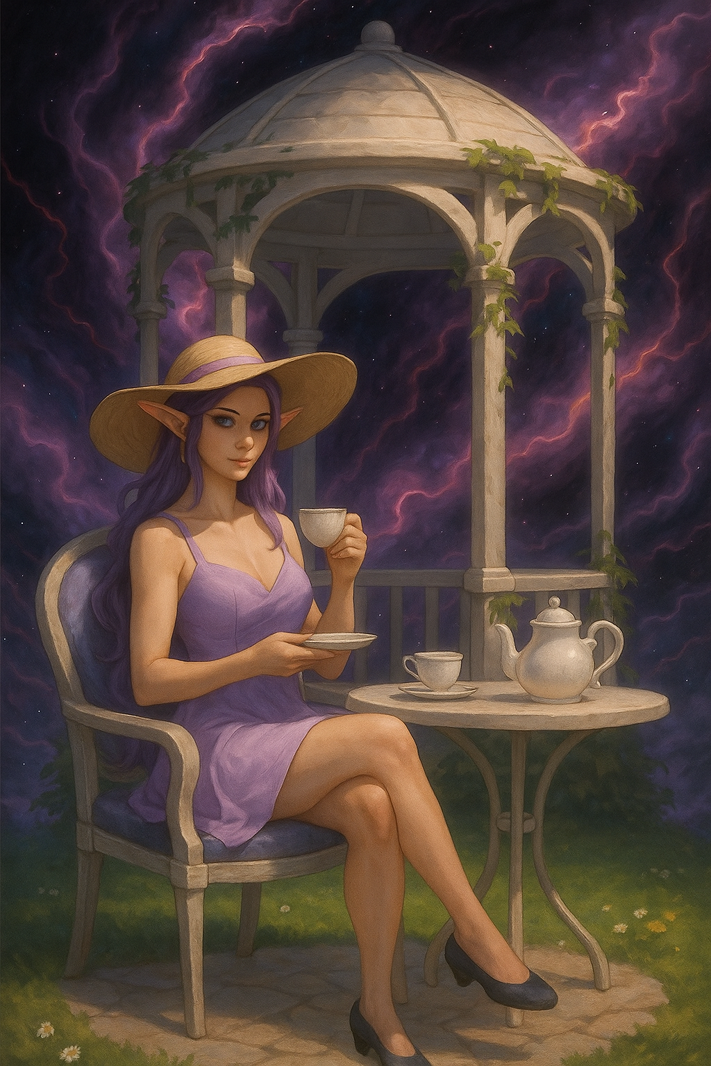 Владелица всего этого великолепия сидела в мягком глубоком кресле. Прекрасная, свежая и юная дева с длинными ушами, глубоко-фиолетовыми глазами и длинными, распущенными волосами, переливающихся от нежно-розового до фиолетового. Короткое летнее платье до середины бедра небесно-голубого цвета подчёркивало фигуру, а на миниатюрных ножках надеты розовые туфельки с небольшим каблуком. Голову покрывала летняя широкополая шляпка. В руках девушка держала чашку с блюдцем, откуда слегка клубился ароматный пар.