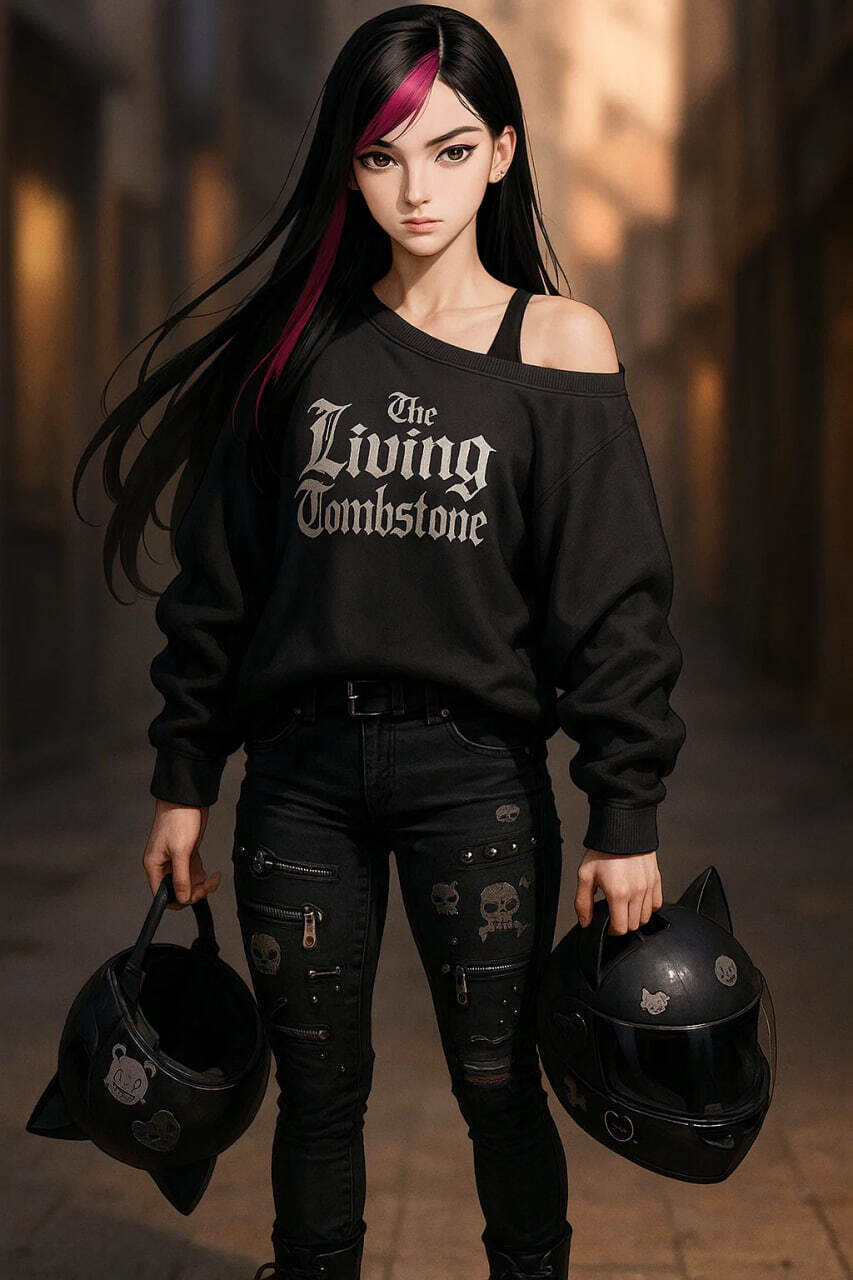 На ногах — тяжёлые, почти армейские, чёрные ботинки на толстой рифлёной подошве, со шнуровкой до середины икры. В одной руке она небрежно держала массивный, сверкающий хромом мотоциклетный шлем с прикольными декоративными ушками, как у кошки, и весь обклеенный какими-то забавными, но немного жутковатыми стикерами в популярном стиле «крипи кьют».