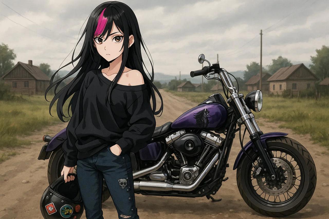 А за её спиной, чуть поодаль, припаркованный прямо у калитки, стоял он — невероятно мощный, матово-чёрный с фиолетовыми вставками, кастомный чоппер, с широкими кожаными сиденьями, огромными колёсами и сверкающим, как зеркало, глушителем. Рама с невероятно изогнутым, высоким рулём, толстые, брутальные цепи, как будто усеянные мелкими шипами. А на огромном, каплевидном бензобаке — потрясающая, профессионально выполненная аэрография с изображением какой-то очень крикливой, розовой пони из этой их дурацкой «Эквестрии», но… в стильной кожаной косухе, с ирокезом на голове и с огромным, заряженным арбалетом наперевес.