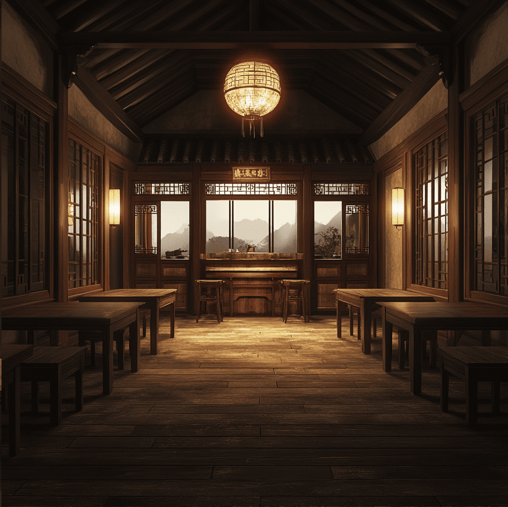 По углам были расставлены голые длинные деревянные столы и жесткие табуретки, а под потолком висел искусный резной фонарь, работавший от примитивной газовой горелки.