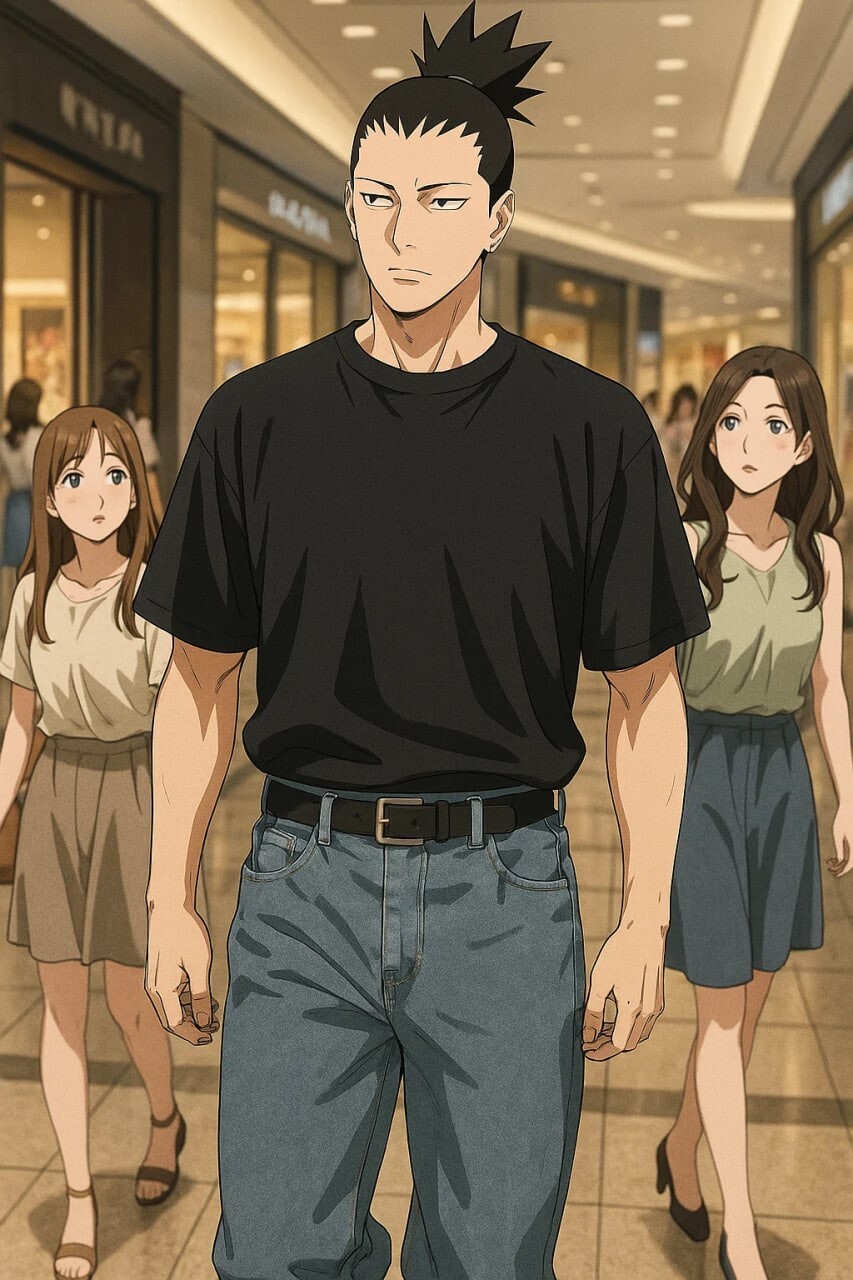 Шикамару шёл чуть впереди, уверенно и не спеша, скользя оценивающим взглядом по витринам многочисленных магазинов. На нём была всё та же черная, уже оверсайз, футболка и мешковатые джинсы, которые теперь больше походили на какую-то неудачную, авангардную попытку создания одежды в стиле «парусный флот» — свободные, бесформенные, провисающие на нём во всех мыслимых и немыслимых местах.