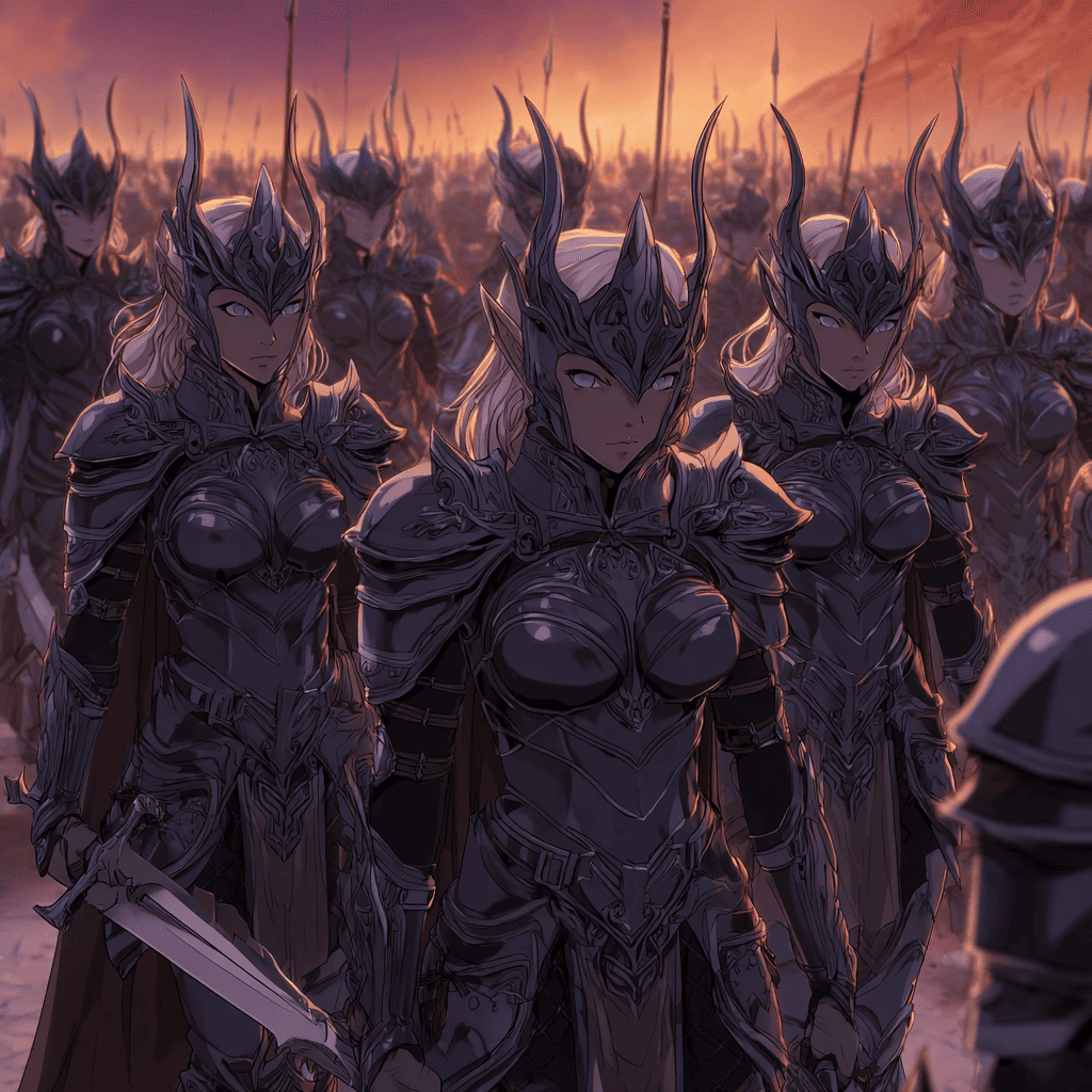 Черные доспехи, полностью закрывающие тело и голову. Клинки и винтовки, поблескивающие красноватым, очень напоминавшим Эфир, светом. Прямые спины, будто каждая из увиденных мной эльфиек лом проглотила и, вишенка на торте, их взгляд.