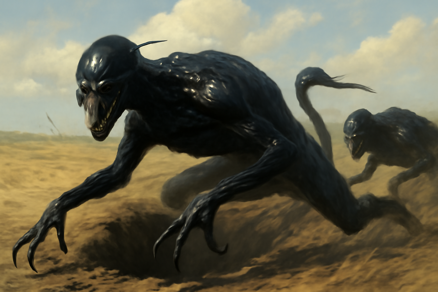 Они вывалились из провала, как черви из вспоротой земли — стремительные, скользкие, неестественные. Их кожа была чёрной настолько, что поглощала свет, словно сажа, смешанная со смолой, липкая и блестящая под лучами солнца. Каждый мускул под ней напрягался, как стальной трос, переплетаясь в гротескных узорах, будто их тела лепили из сырого мяса и проволоки.