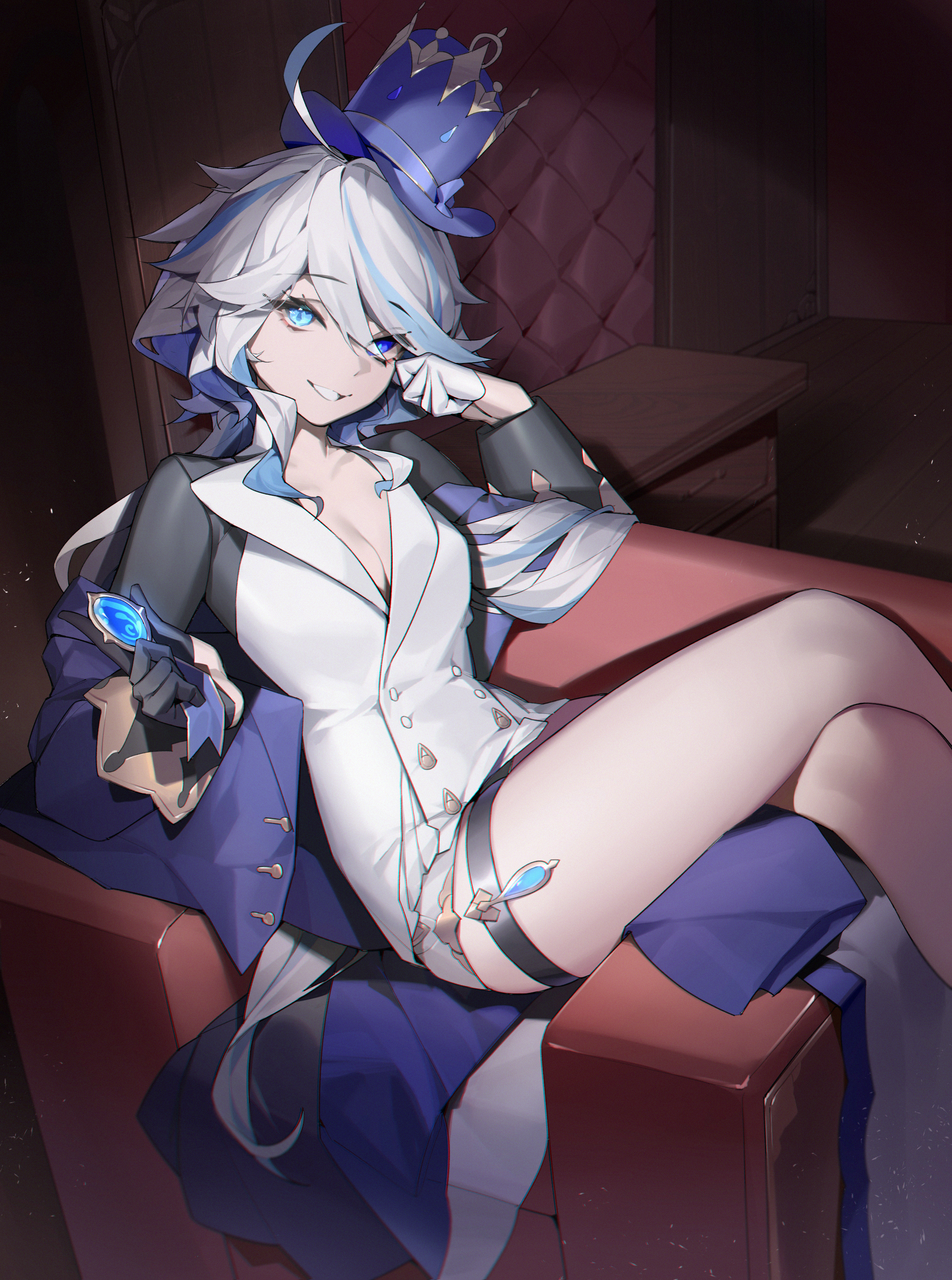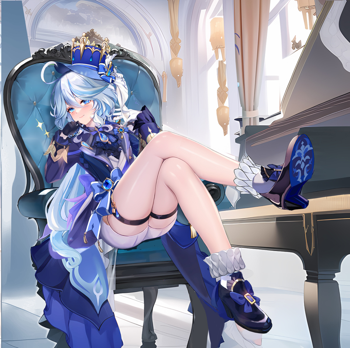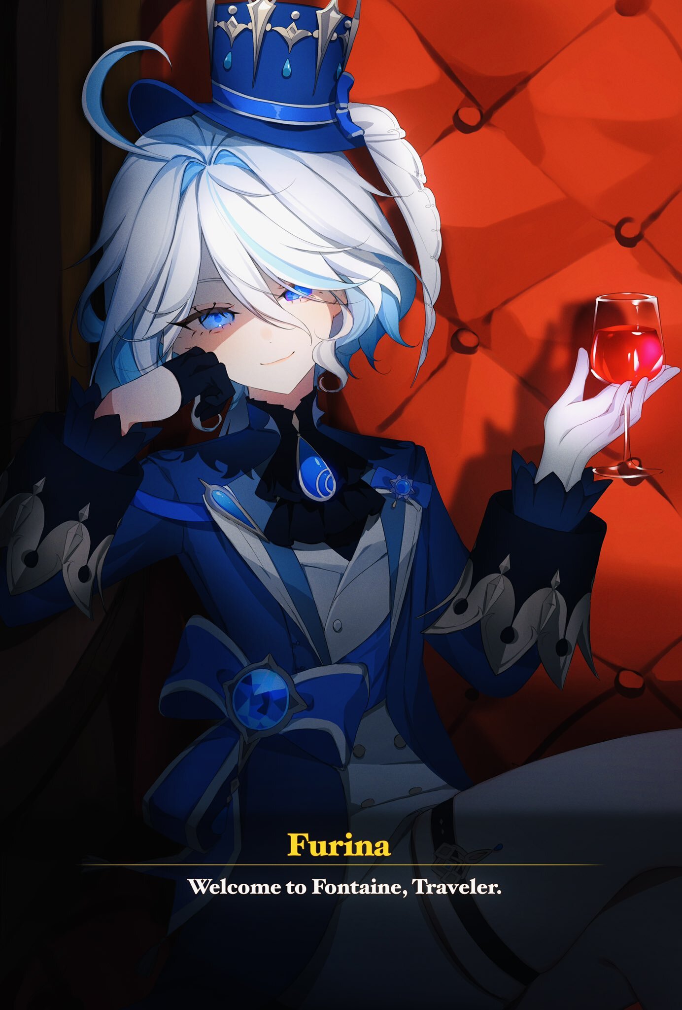Напротив окна, в роскошном кресле, почти троне, обитом голубым шёлком с золотыми узорами, сидела Фурина де Фонтейн, Гидро Архонт собственной персоной. Её синий фрак и шляпка, украшенная тонким пером, были такими же, как в тот день, когда я видел её в столице. Она сидела спиной ко мне, в одной руке — серебряный фужер, поблёскивающий в свете, в другой — лист бумаги, который она небрежно держала между пальцами.
