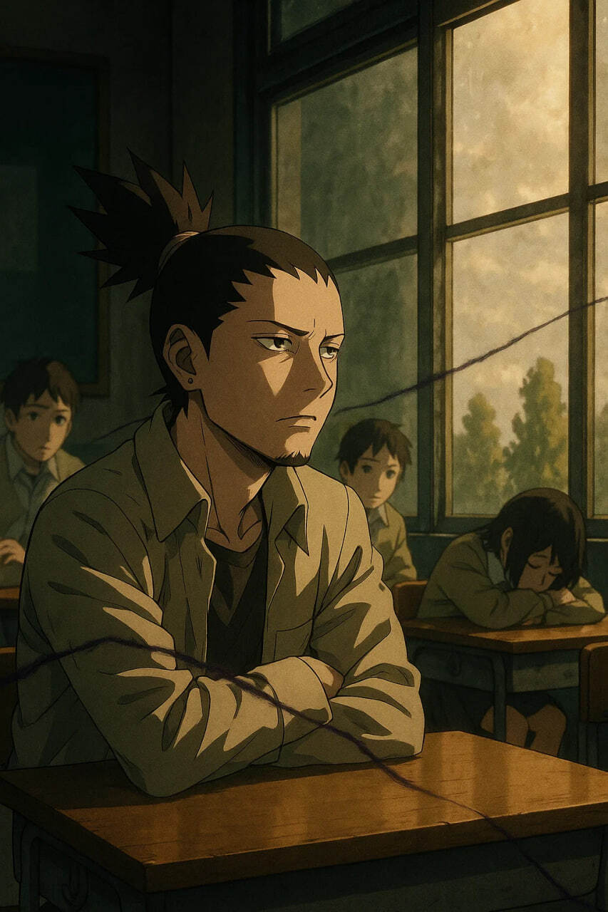 Он, как и вчера, сидел у самого окна, рассеянно глядя на школьный двор, где от лёгкого утреннего ветерка едва заметно колыхались верхушки старых, высоких тополей. Учитель по литературе с причёской в виде кактуса, что-то монотонно, без всякого выражения, вещал про особенности композиции в какой-то там повести, кажется, Пушкина, и время от времени пытался даже читать какие-то отрывки с выражением. Но для Шикамару всё это казалось каким-то далёким, бессмысленным белым шумом — почти как назойливое, монотонное гудение старых ламп в школьном коридоре. Слова, конечно же, проникали ему в уши, но тут же, не задерживаясь, вымывались наружу, не оставляя в его памяти ровным счётом никакого следа.
