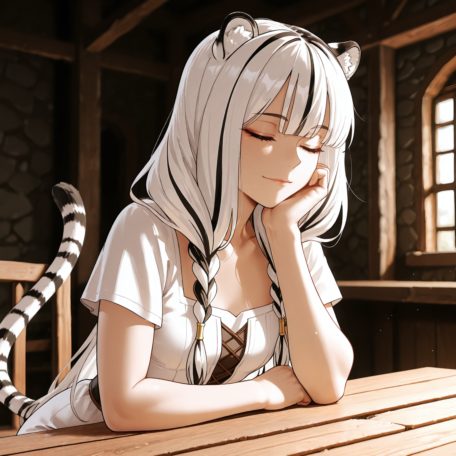 Небольшой рост — где-то метр шестьдесят максимум. Шелковистые волосы, настолько белоснежные, что по своей чистоте способны посоперничать даже с первым выпавшим снегом. Они струились, опадая на её плечи и перемешиваясь с редкими чёрными локонами, что лишь сильнее притягивали взгляд к необычному сочетанию и подчёркивали бледность её кожи.