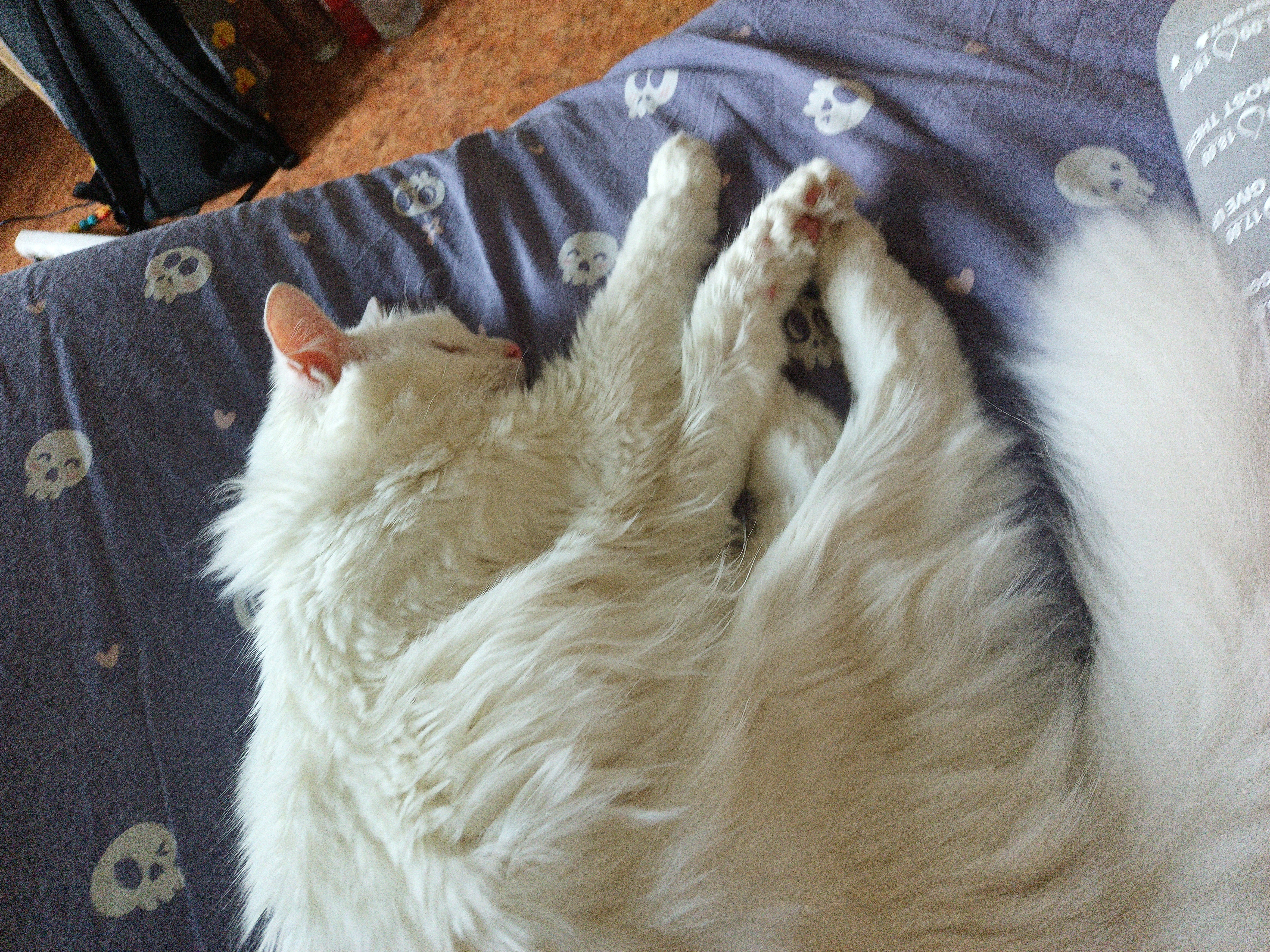 Отдыхает после ветеринарной клиники и обследований. И живот побрили, и кровь взяли, и в пасть заглянули.