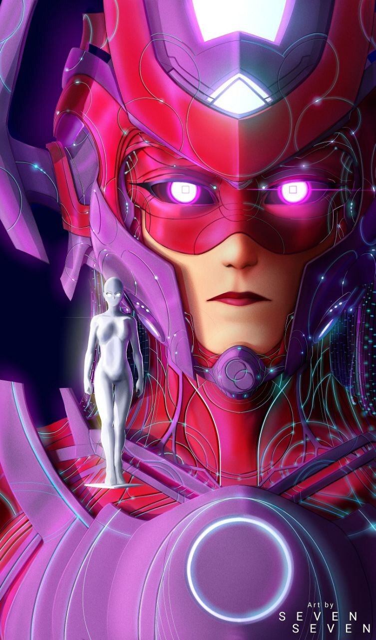 — Да, Госпожа, и я готова служить! — были её первые слова после того, как преображение закончилось и новонареченная Сёрферша обнаружила себя стоящей на своей доске в открытом космосе прямо перед гигантским ликом своей Госпожи. Та восседала на громадном троне, что располагался по центру её округлого корабля воистину колоссальных размеров. Могучее тело Пожирательницы Миров было целиком и полностью заковано в высокотехнологичные фиолетовые доспехи, а суровое, но явно вполне себе красивое лицо скрывал вытянутый вверх шлем цилиндрической формы, с парой отходящих в области ушей плоских «антенн», что оставлял открытым лишь нос, рот и горящие ярко-фиолетовым светом глаза.