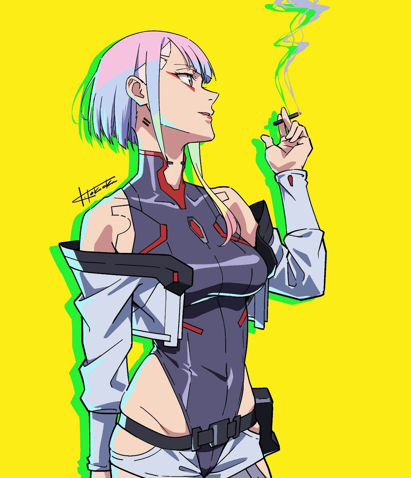 Что касается самой Люси, то внешне она почти не отличалась от того изображения, что я видел во время наших коротких звонков. Довольно высокая, стройная, с короткой стрижкой и длинной чёлкой. Другой была лишь её одежда — укороченный и оставляющий много частей тела открытыми, чёрный костюм нетраннера, белый жакет и шорты, а также длинные чулки и высокие сапоги. Нарочито сексуально, даже по меркам этого мира…