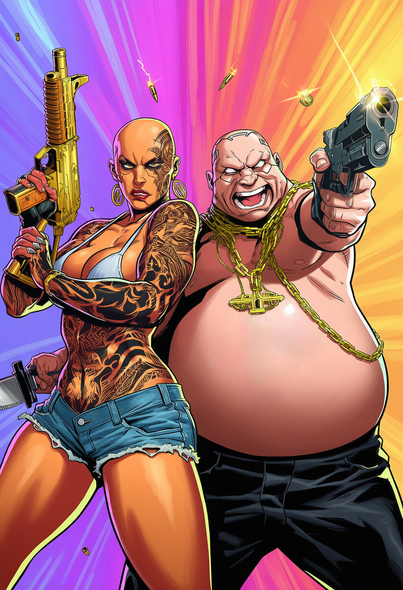 Первой в меня начала стрелять какая-то лысая баба в наколках. Ей тут же вторил её напарник — голый по пояс толстяк с огромной золотой цепью на шее.