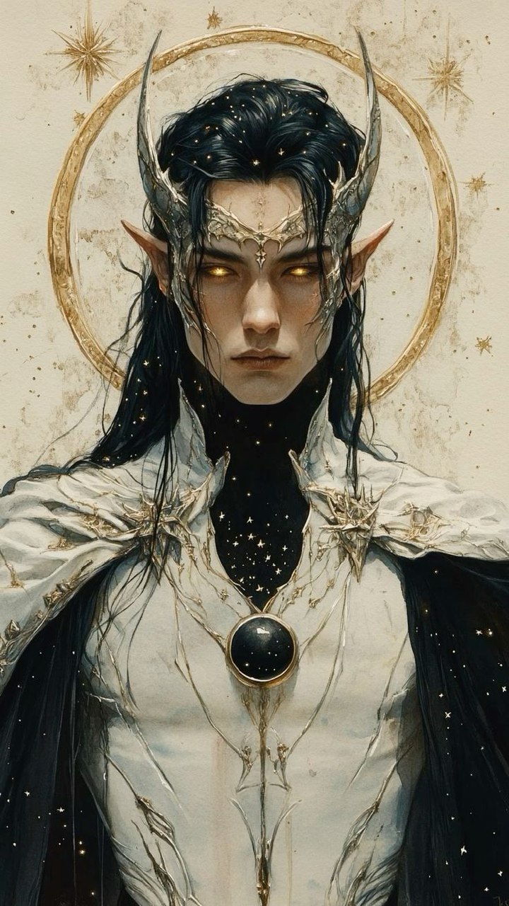 Фигура раздалась вширь, став еще чуточку выше и массивней, отвергая эльфийскую жилистость и худобу. Она начала наполняться цветами. Стало возможно отличить кожу от белой рубашки и плаща, расшитых золотыми нитями. Волосы из пепельных превратились в насыщенно-черные. Черты лица остались прежними, разве что самую малость заострились. Из висков вверх росли немного изогнутые рога. Глаза лишились вертикального зрачка, став полностью золотыми. Сам белок начал походить на янтарь, внутри которого застыла далекая вспышка света.