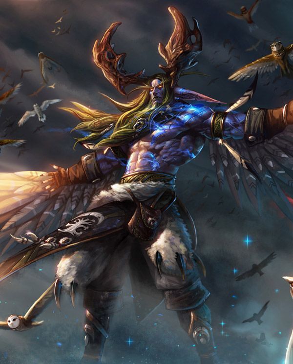 Верховный друид оказался высок даже по меркам калдорай — он вытянулся до двух с половиной метров. Из головы у него росли два мощный рога, добавлявших ему еще почти сорок сантиметров в высоту. Глаза светились золотом. Лицо казалось вытесанным из камня, стоическим и твердым, почти грубым. Его обрамляли темно-зеленые длинные волосы и густая борода. Одежды, не считая меховых штанов, пояса и перчаток, он не носил, от чего грудь оставалась открытой. Помимо мышц, о фактурности которых могли позавидовать многие врайкулы, были видны налитые яркой синевой татуировки. Из рук с внешней стороны густо росли перья, похожие на птичьи крылья.