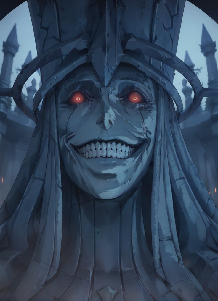 Каменное лицо статуй было искажено в зловещей ухмылке. Глубоко посаженные глаза светились неестественным светом, словно заглядывая прямо в душу.