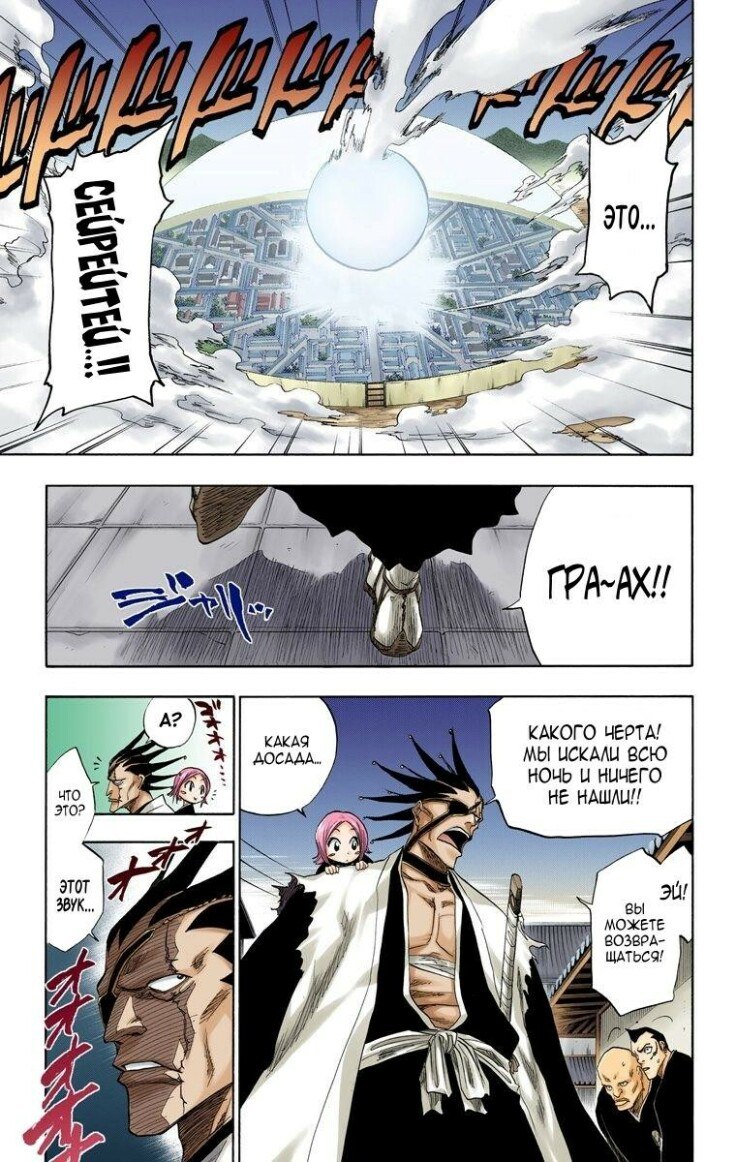 Как же мистер Кубо пролюбился с этим изображением Сейрейтея. По всем признакам, начиная с разговоров персонажей, логики действий и заканчивая дальнейшими изображениями местности внутри стен, — Сейрейтей огромен. Йоруичи в главе, когда Гин не даёт героям пройти сквозь врата, говорит, что идти от одних врат до других десять дней. Вроде бы в новеллах был момент, когда персонажи шли несколько дней от ворот Сейрейтея до бараков отряда. И тем не менее мистер Кубо нарисовал это… Деревню на двести домов. И до сих пор, даже несмотря на все последующие опровержения и демонстрацию просторов в аниме, особенно в ТКВ-арке, находятся индивидуумы, которые утверждают, что Сейрейтей — деревня, потому что когда-то видели вот этот кадр манги… Не будьте такими индивидуумами. Кубо просто поленился, или не успел, или не смог по скиллу нарисовать нормальный арт, когда делал эту главу. А потом уже не стал переделывать.