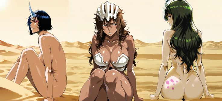 Вместо звероподобных монстров на остекленевшем песке теперь три обнажённых девушки. От прежних форм у них только куски масок да дыры. Кстати, у всех трёх дыры пустого оказались в одном и том же месте — чуть ниже грудей, ровно посередине. Подле каждой — Занпакто в запечатанной форме.