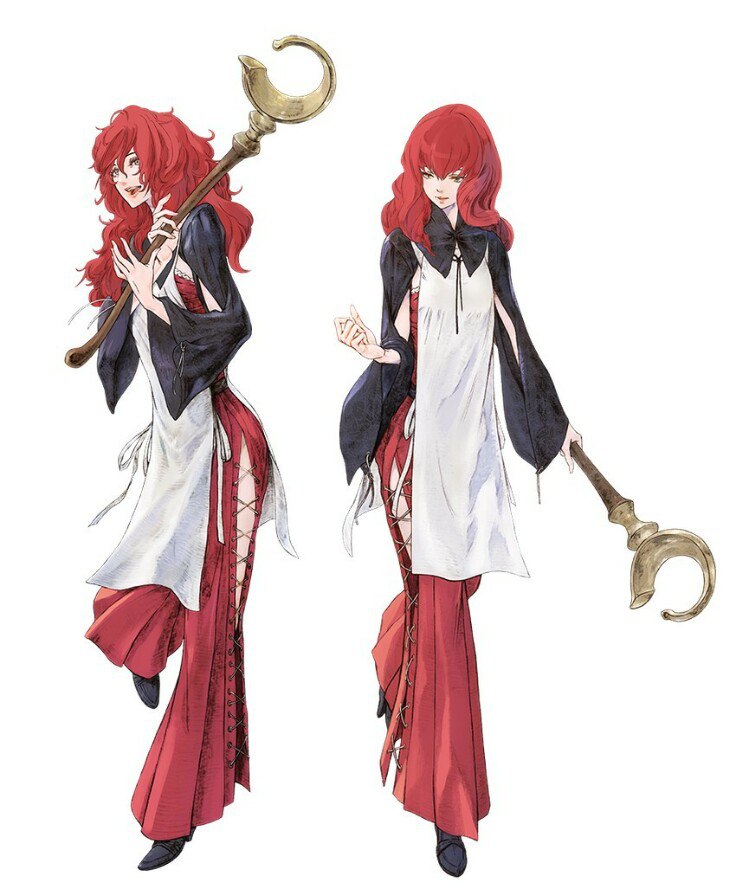 Она была задумчива, с лёгкой, почти загадочной улыбкой, глядя мутным взглядом куда-то в сторону, пока её руки, словно живя собственной жизнью, извлекали мелодию из струнного инструмента. Её длинные тёмно-алые волосы спадали на плечи, а тёмный плащ с красными вставками оттенял белую рубашку, перевязанную шнуровкой. Но приближение массивной фигуры прервало её игру — она подняла взгляд, и удивление отразилось в её глазах, когда пальцы замерли на струнах.