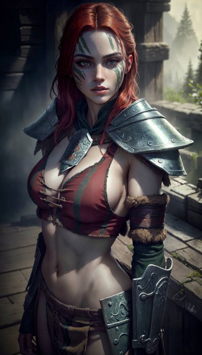 Новая женщина была не одна. Рядом с ней стоял очень крупный мужчина в черных доспехах. На спине у него висел массивный меч. Черты его лица были скандинавскими, возможно, даже нордическими. Он излучал силу и опасность. Шрамы, свидетельствующие о многочисленных сражениях, испещряли его открытую кожу.