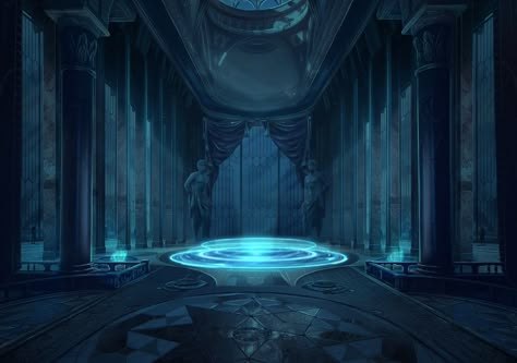 Войдя на территорию донжона-дворца, мы быстрым шагом преодолели несколько коридоров в таком же готическом стиле с голубоватыми и тёмно-синими оттенками, прежде чем оказаться… В весьма занятного видна тёмном помещении с колоннами и стёклами, посреди которого сиял магической силой голубоватый круг, внутри которого на небольшом возвышении в воздухе висели ещё два таких же круга.