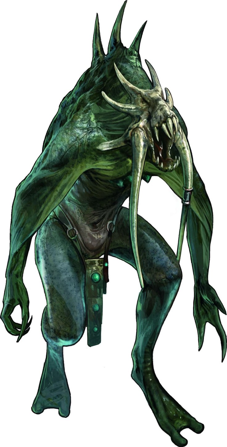 Напоминающее огромную антропоморфную лягушку, только бывшую с пастью какого-то противного даже самой эволюции чудовища без всяких глаз, но с свисающими отростками.