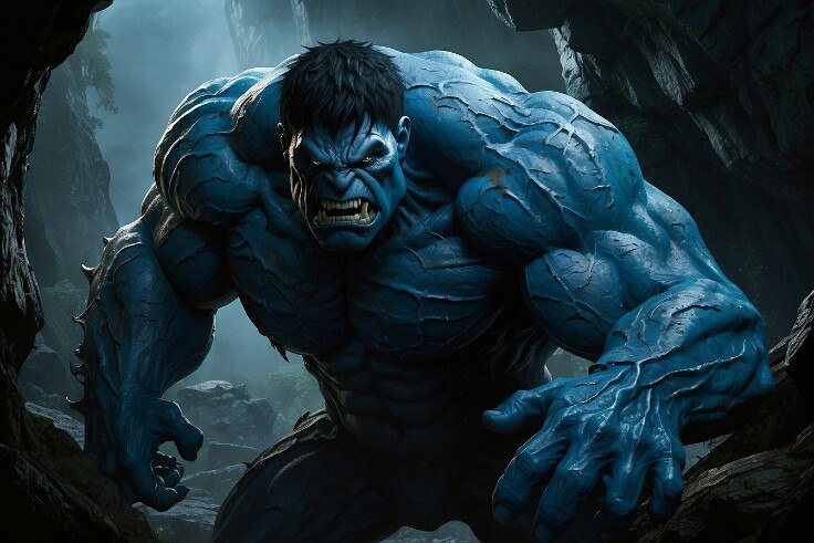 Мгновение. Другое. И вот на месте среднего роста человека остался стоять трёхметровый бугай с синей кожей и гипертрофированной мускулатурой. Всю одежду, что была на нём, разорвало в клочья. Жилет с зельями порвался пополам и упал к ногам, как и походная сумка, у которой оторвалась лямка.