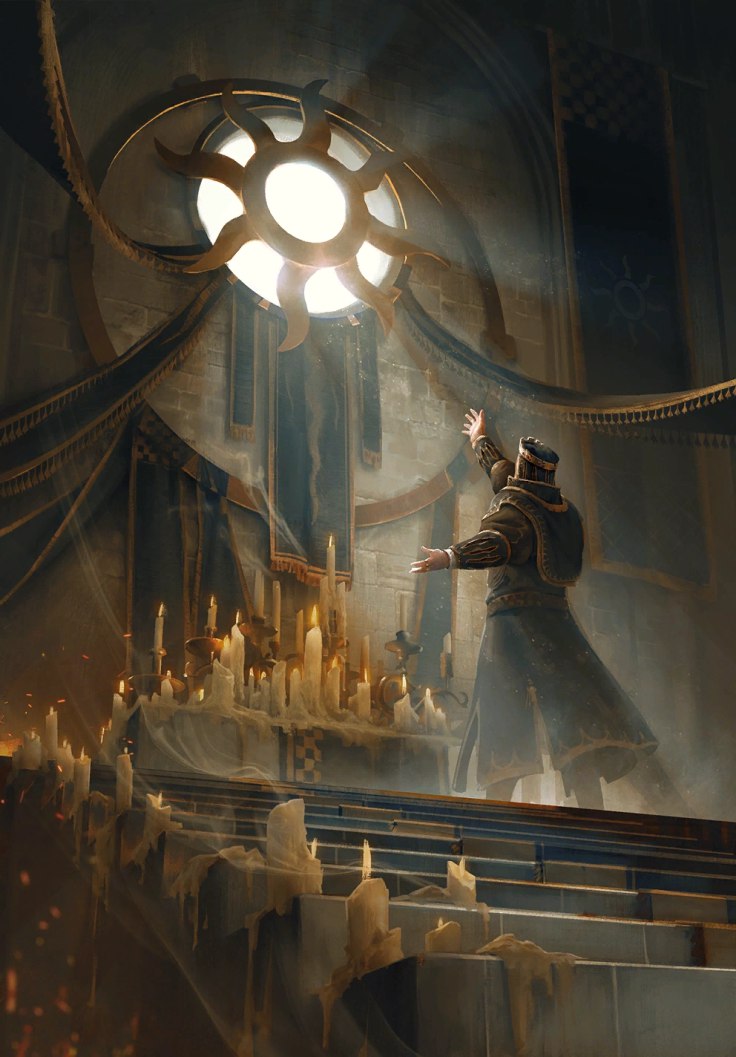 …Наконец, Торрес остановился на возвышении перед алтарём с десятками потухших и ещё горящих свечей, что в Культе Великого Солнца считались малыми воплощениями главного божества их религии — самого Солнца, что по верованиям живущих тут ранее эльфов считалось тем, что давало жизнь всему живому. И даже последний крестьянин был согласен с этим — ведь без солнечных лучей не вырастет его урожай, не согреется он от ночных холодов…