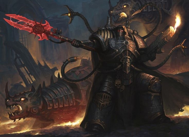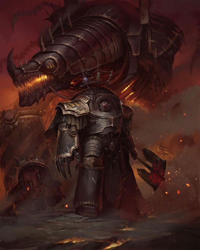 Это ветеран ВКП, Ереси Хоруса, Воин Легионов, ну и Долгой Войны. Причем если судить по самой работе, наш ГГ стал Кузнецом Войны, еще во времена Ереси. То есть перед нами должен быть, ну как минимум матерый ренегат, или даже матерый хаосит. Кузнецы Войны или же Варп-Кузнецы — это предводители варбанд Астартес Хаоса, что ведут свою генетическую линию от Железных Воинов.