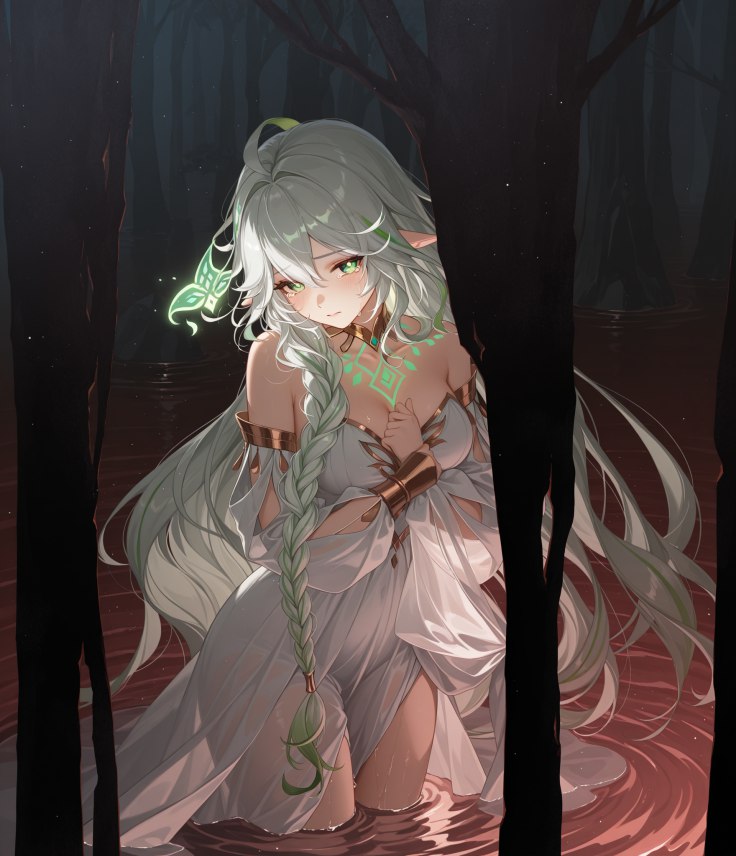 Руккхадевата была жива, но пребывала в глубоком сне, её грудь едва заметно поднималась от слабого дыхания. Она действительно была похожа на взрослую версию Нахиды — те же тонкие черты лица, но более зрелые, с длинными ушами и белыми волосами, струящимися по её телу, как водопад. Её одеяние, некогда великолепное, было изорвано и пропитано чёрной водой, которая превращала ткань в подобие цепей, сковывающих её с полом.