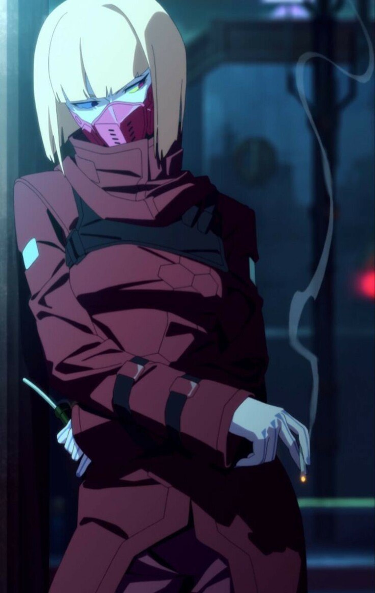Высокая, стройная, если не сказать тощая, девушка лет тридцати. Была одета в длинное красное пальто и штаны, на ногах высокие сапоги. Не красива, но в целом симпатична. Короткие светлые волосы, стрижка каре, узкие глаза. Нижнюю часть её лица закрывала плотная маска (на самом деле это была часть цельного импланта, заменяющего ей челюсть) …