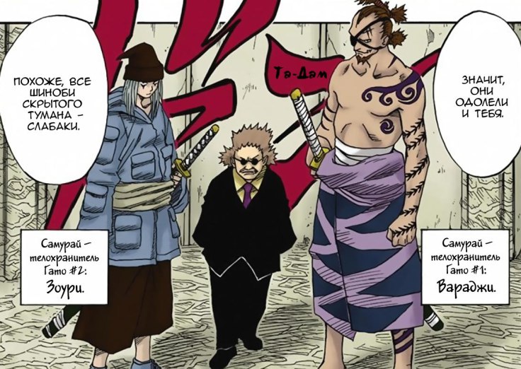 — Я разберусь с Забузой, — скомандовал Какаши. — Вы трое — защищайте Тазуну и разберитесь с его помощником!