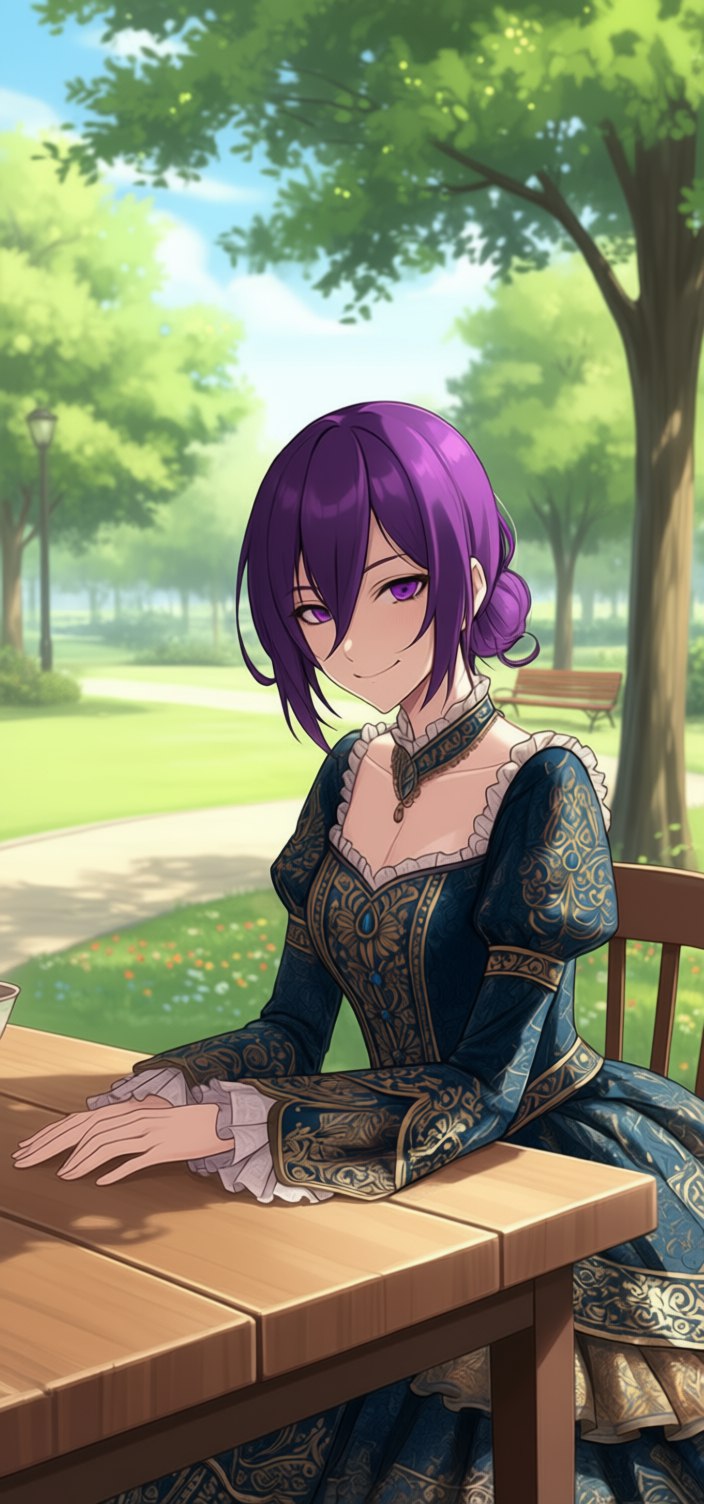 Так, за намётками будущих действий, меня и застала примечательная парочка из девушки в красивой светлой шляпке и пышном «дворянском» платье с множеством рюш и кружев, идущей в сопровождении то ли слуги, то ли охранника с замотанным в ткань габаритным изогнутым предметом, который тот нёс на плече. Подойдя к моему столику, «дворянка» дождалась, когда «слуга» отодвинет ей стул и подвинув его, величаво присела рядом, тогда как сопровождающий «прислужник» остался стоять за её плечом.