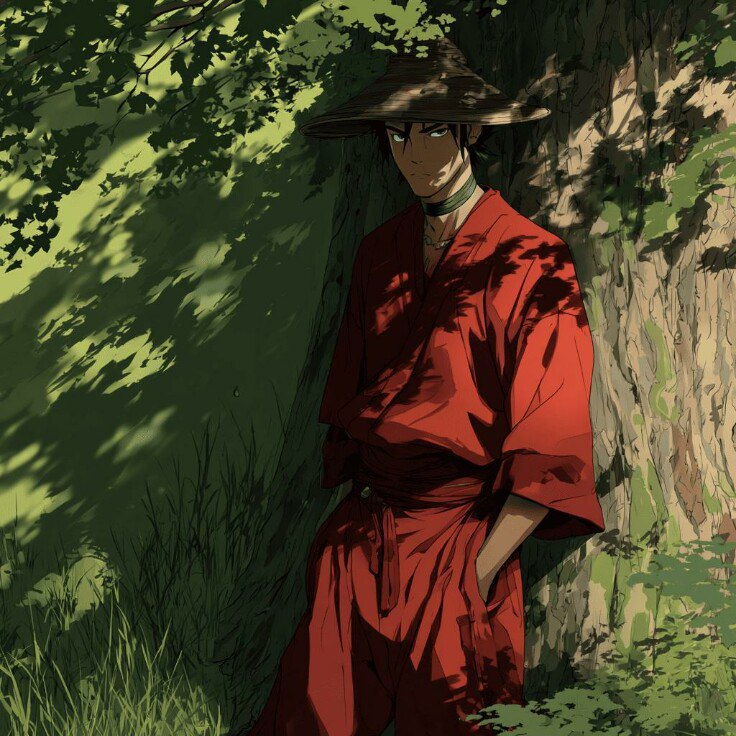 Пока Зуко и Катара пытались спасти деревню и не нарваться на драку с жителямит, за ними внимательно наблюдал одинокий человек. Простое красное ханьфу, перевязанное красным поясом. Соломенная шляпа. Поношенные сандали. Черные, перевязанные в короткий хвост, волосы.