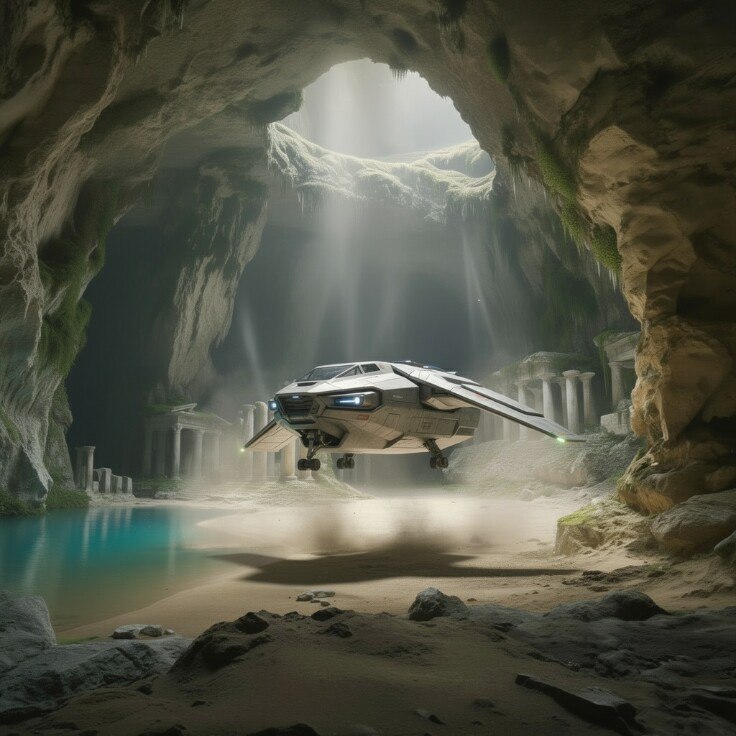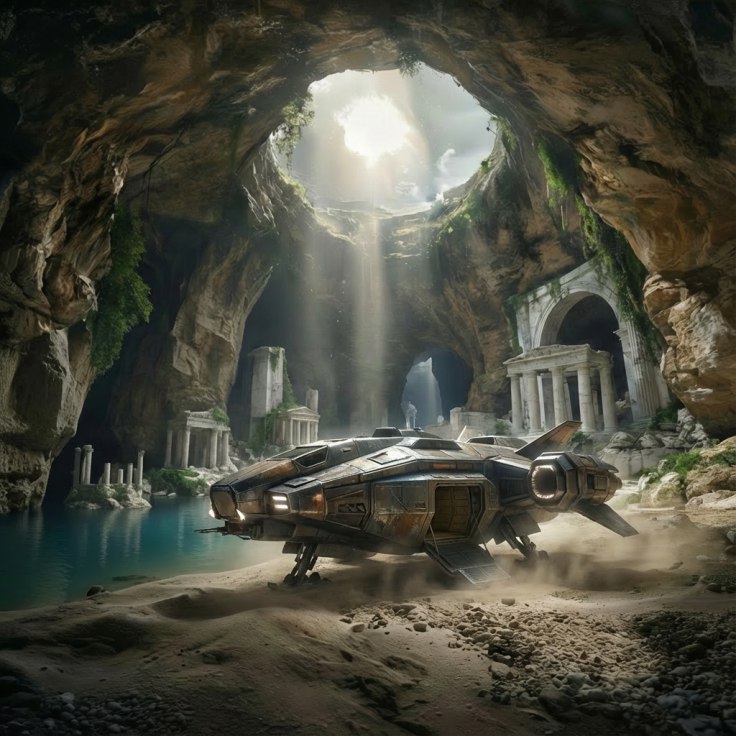 Неровные тёмно-серые стены воронки промелькнули быстро и челнок оказался в огромном скальном гроте. Прожектора освещали огромную пещеру, песок и мелкую гальку внизу, кое-где виднелась, как зелёная, так и изрядно порыжевшая зелень. В этом полушарии Мистерии уже наступила зима, пусть и конкретно здесь снежного покрова не наблюдалось. Зато миль на двести севернее он уже вовсю лежал. Однако куда интереснее выглядели для спустившихся с небес людей древние даже на вид руины, расположившиеся у самой воды. Выложенная белыми плитами дорога с лестницей, спускавшейся к самой водной глади, столь же белые высокие арки и колонны… И, конечно же, она. С замиранием сердца, Чарльз судорожно сглотнул, когда луч света выхватил из тьмы простёршуюся от края до края подземелья идеально-ровную серебристую стену.