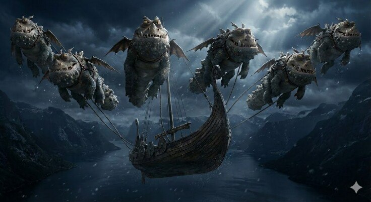 Словно в подтверждение, воздух слева, прямо на борту разбитого драккара, пошел рябью и проявил второго ящера — чуть меньше, зеленоватого оттенка. Он сидел там всё это время, наблюдая за нами с момента прилета, за что ему плюсик в копилку –— не напал сразу. Справа, из-за груды мусора, бесшумно вытекал третий.