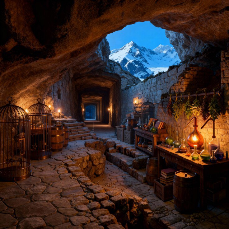 На другом конце зала начинался ещё один длинный проход, в конце которого брезжил белый дневной свет — выход наружу, не иначе. Это помещение оказалось заставлено куда плотнее предыдущих: массивные деревянные столы и даже каменные плиты на ножках, испещрённые непонятными символами, странные железные конструкции с прорезями, под которыми горел огонь, а в дальнем углу расположилось даже нечто похожее на алхимическую лабораторию.