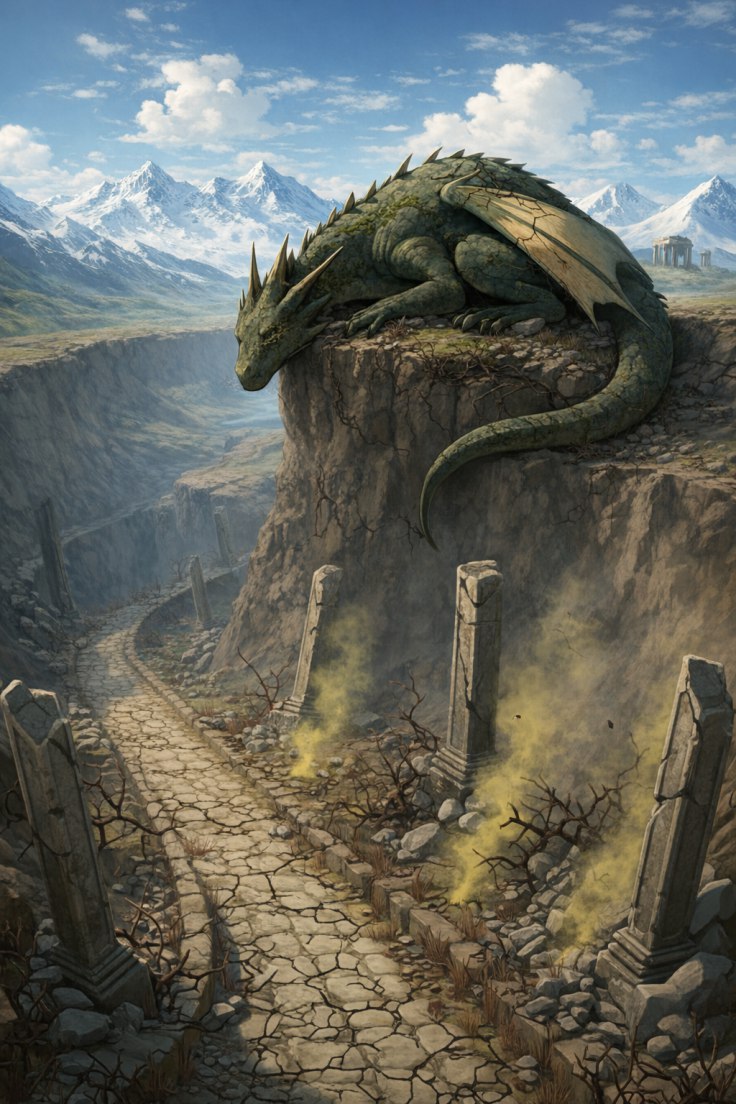Похоже, это была та самая драконица, которую сумасшедшие культисты почитали за воскресшую Андрасте. За чудищем наблюдали больше часа, но зверюга за всё это время даже не пошевелилась. Надежд, что она улетит куда-то становилось всё меньше. Гектор уверенно опознал в ней высшую драконицу, которой уже не одно столетие. Крылатый монстр мирно спал и плевать хотел на суетящихся внизу людей. Горы там каменным цирком возвышались вокруг, образуя настоящий кратер. Когда-то очень давно через него пролегала дорога, мощёная крупными плитами, с откосами и заграждениями. Ныне же от неё осталось чертовски мало: сохранилось с десяток метров у выхода из драконьих пещер, а большинство высоченных обелисков, некогда возвышавшихся вдоль всего пути, были сломаны. Чем дальше, тем больше дорога превращалась в узкую тропинку с редкими вкраплениями древнего полотна.