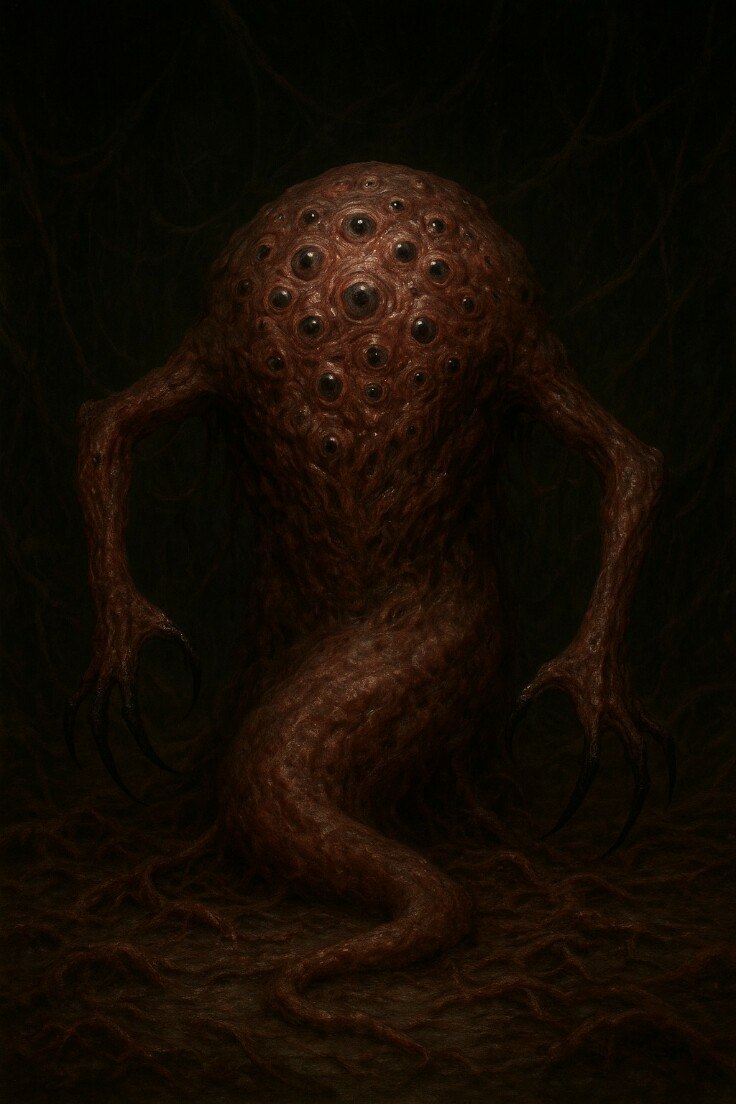 Существо нельзя было описать словами. Оно не имело формы — скорее, огромный четырехметровый сгусток мяса, пульсирующий в такт собственному дыханию. Его поверхность покрывали десятки глаз — живых, шевелящихся, моргающих вразнобой. Каждый глаз смотрел в свою сторону, но все они видели одно — её. Нижняя часть тела представляла собой бесформенный вал, скользящий по полу, как тело гигантской улитки. Из верхней массы тянулись руки — слишком длинные, неправильные, с когтями, напоминающими черные лезвия. Каждое движение сопровождалось влажным, хлюпающим звуком, будто кто-то месил живое мясо.