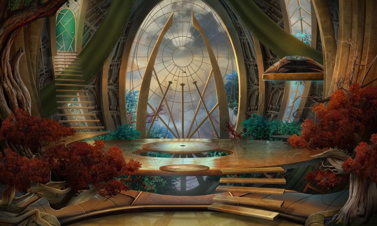 Вокруг круглого стола, парящего над землей безо всяких ножек расположились уже вполне себе обычные резные троноподобные стулья с высокими стенками.