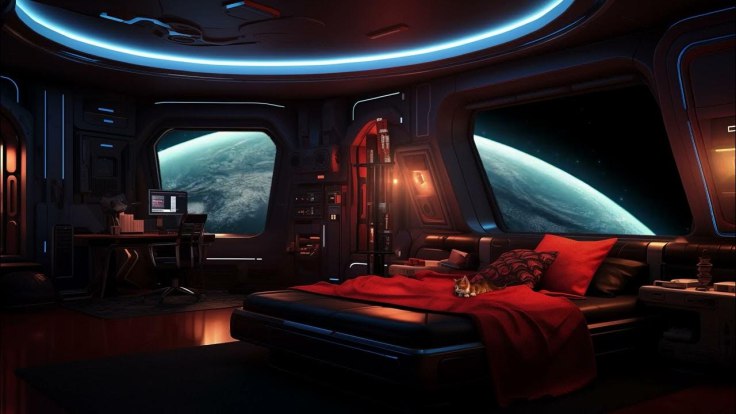Само помещение являлось спальней, выполненной в редкой для этого космического будущего стилистики сай-фая… Люди ныне более предпочитают готичность, но во времена Тёмной Эры Технологий и Федерации Человечества — они были классическими любителями sci-fi, да такими, что Тау, которые ещё небось не эволюционировали в разумных существ, из-за зависти будут пену изо рта пускать.