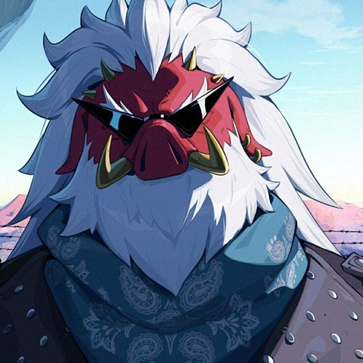 Морда, как и всё тело, с красной шкурой, седые волосы стояли торчком, напоминая гриву. Густые бакенбарды, вместе с волосами и бородой, также были седыми, а из-под очков взирал свирепый взгляд… по крайней мере мне он казался именно таким.