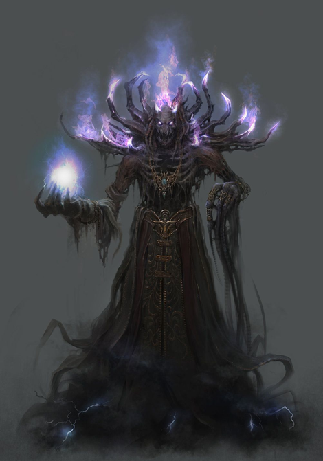 Его лицо исказилось в причудливой гримасе: края беззубого рта растянулись до самых ушей, заполнившись рядами гнилых зубов; глазницы впали, блеснув потусторонними фиолетовыми огнями; опали наземь усы, еще в воздухе растворившись невесомой дымкой. Кожа старца посерела, начала гнить, как и его одежды, обнажая черные ребра, покрытые остатками гнилой плоти, а из загривка его, извиваясь и ветвясь, полезли хитиновые лапки, концы которых исторгали фиолетовое пламя. И замерли они на манер широкого воротника, лишь иногда совершая невесомые движения, сдобренные неприятными щелчками.