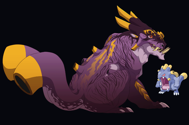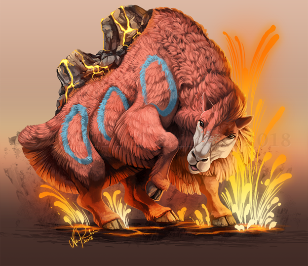 Оба мы пропустили сие заявление мимо ушей, продолжив заниматься своими делами. Уже буквально через десяток метров, мы наткнулись на источник гейзера. Мощного вида парнокопытное, покрытое густой бледно-бордовой шерстью с тремя выделяющимися узорами в виде синих колец на каждом боку. На спине сей массивной фигуры располагался каменный нарост, покрытый раскаленными лавовыми подтеками, а чуть ниже, уходя к короткому хвосту-обрубку, прямо в спине зияла дыра, края которой были покрыты каменным крошевом. Недовольное создание закрывало своим массивным телом выход из шахты, представляющий собой точно такую же дыру, как и наверху, только с оплавленными краями. Зверь всем видом показывал, что сначала он разберется с нами, а после пробьет себе выход, и плевать ему, что за стенкой, которую он так активно таранил собственным же горбом, выхода уж точно нет.